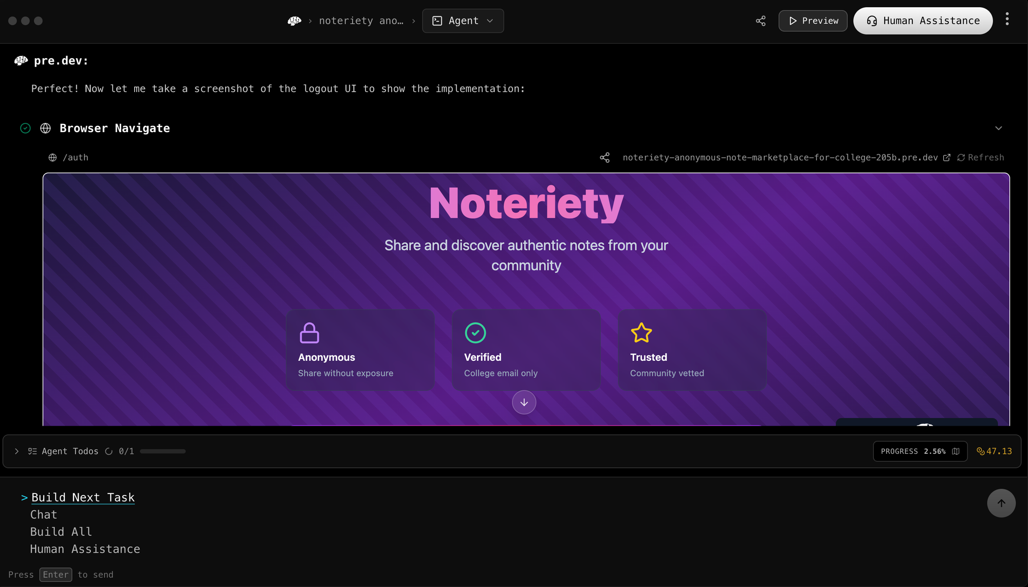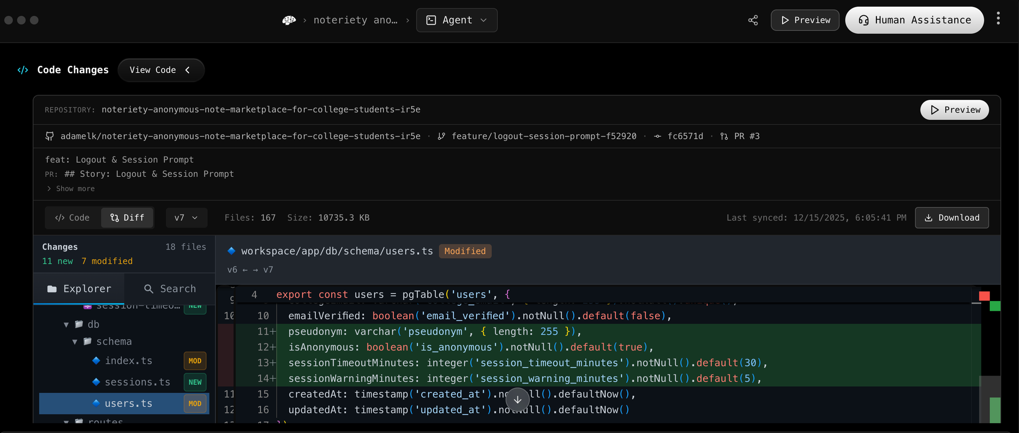 That's it. No tech stack decisions. No file structure planning. No environment setup. Just: "I want to build an anonymous note marketplace for college students with a dark theme and purple accents."