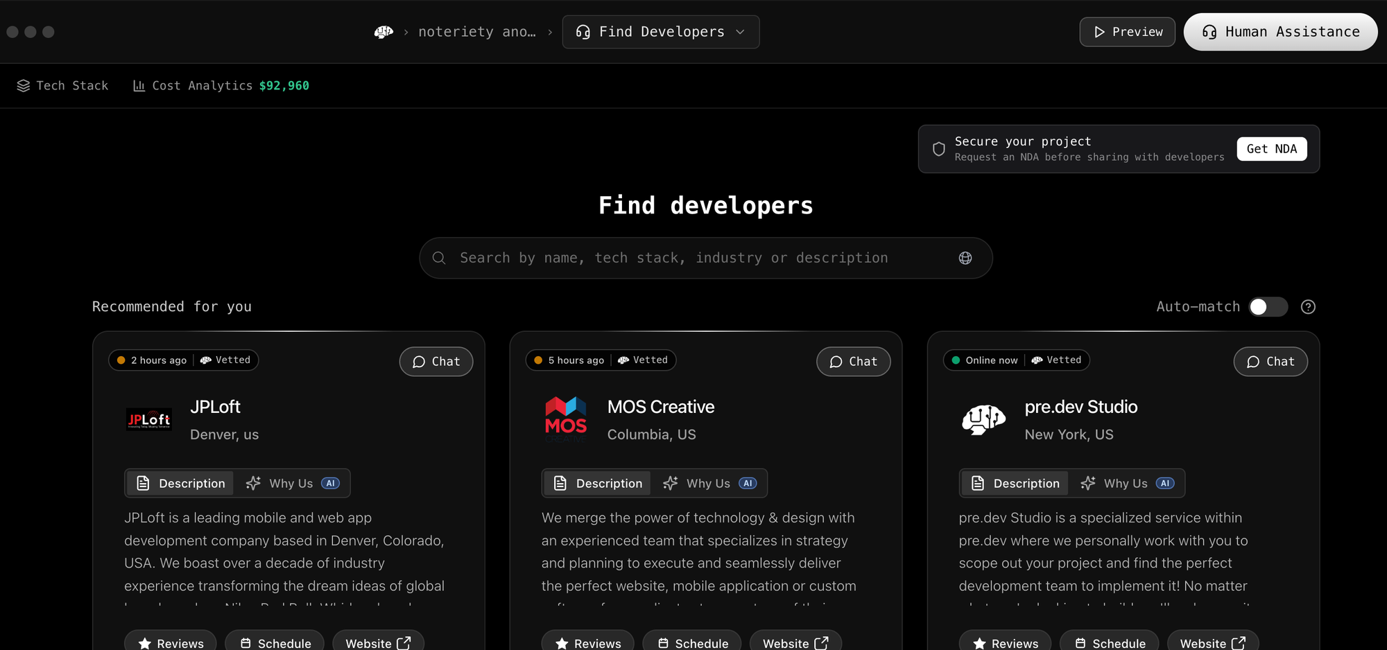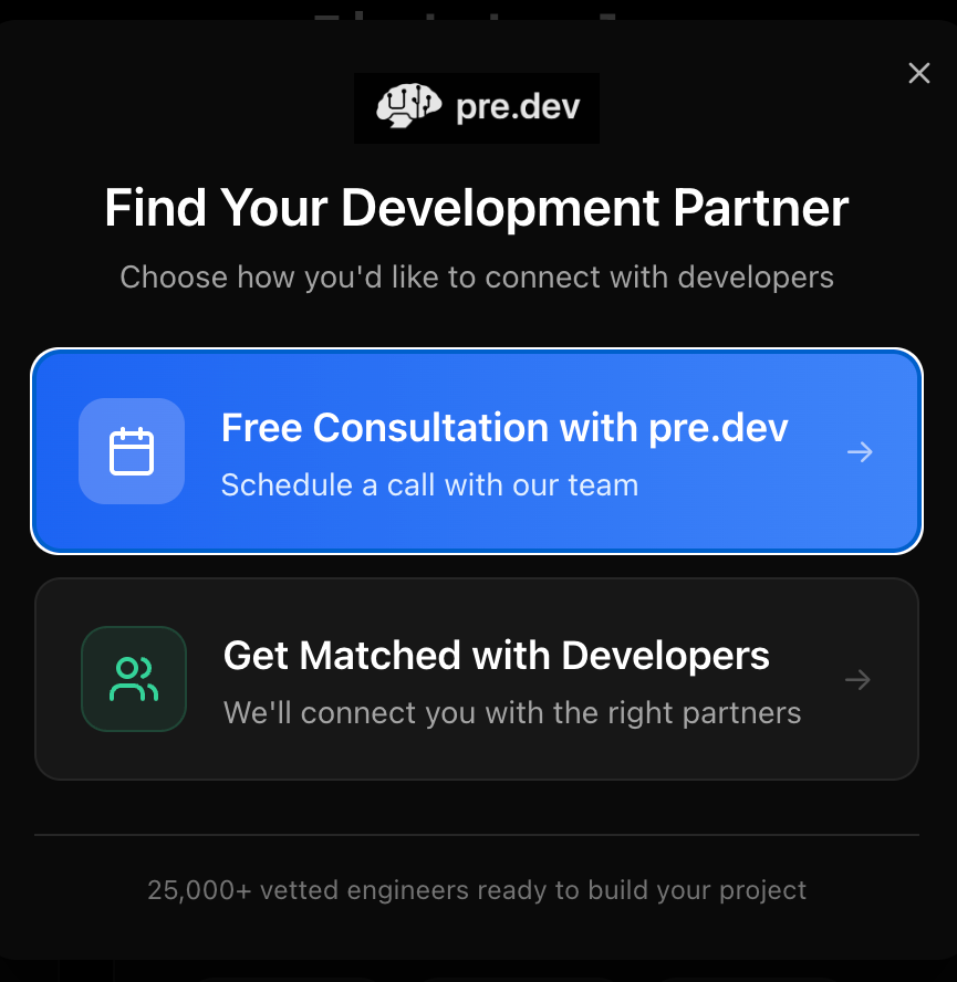 pre.dev includes a built-in network of vetted development agencies. If you hit a wall, you can get quotes from multiple shops—already aligned to your architecture and roadmap—within hours instead of weeks. No more Upwork roulette.